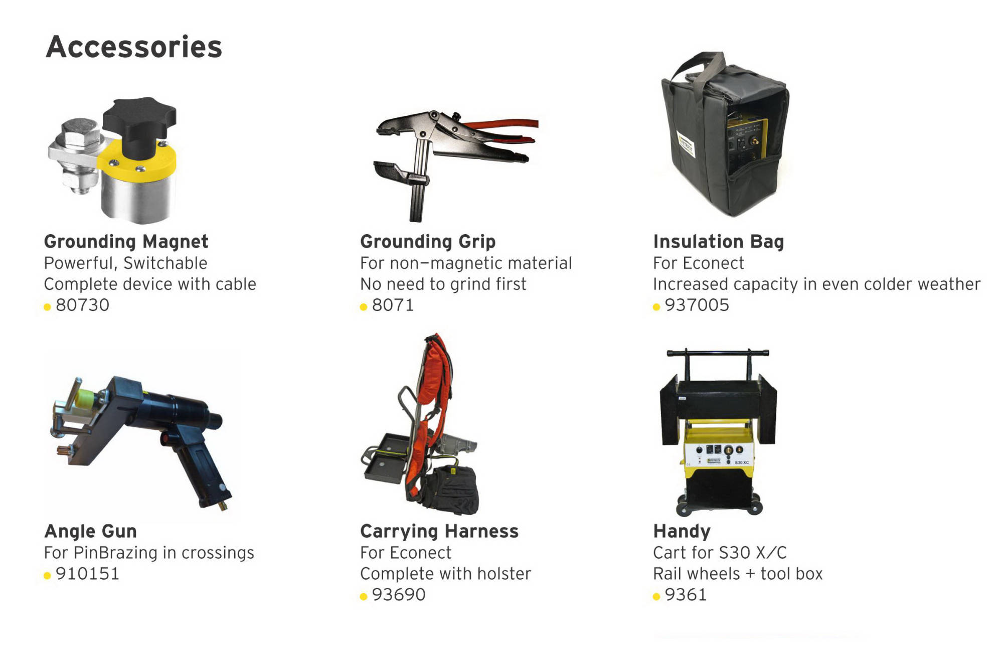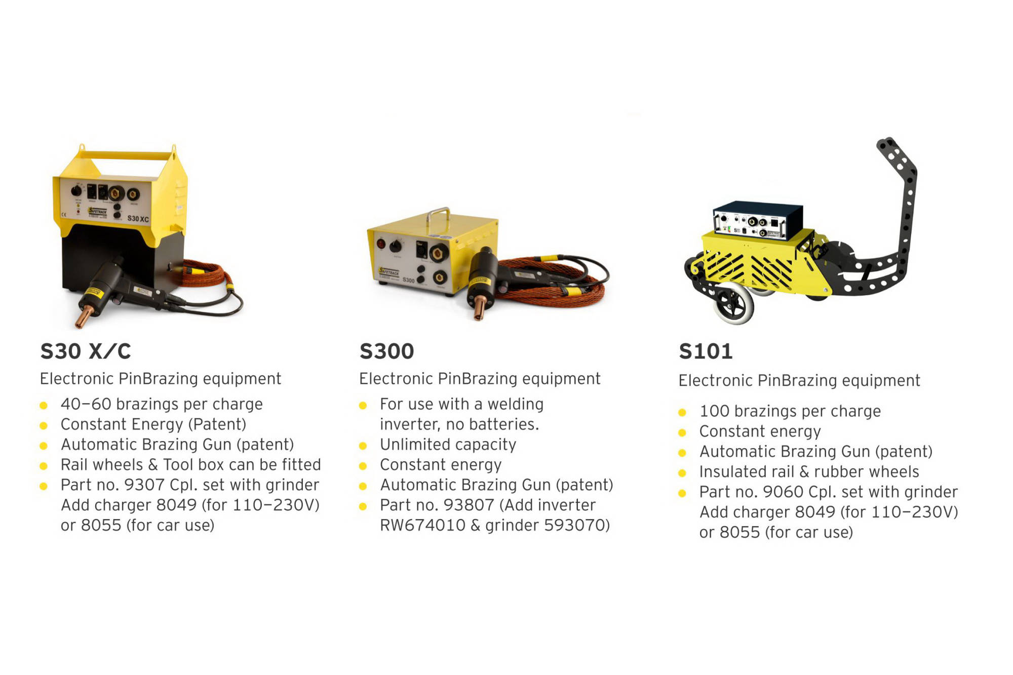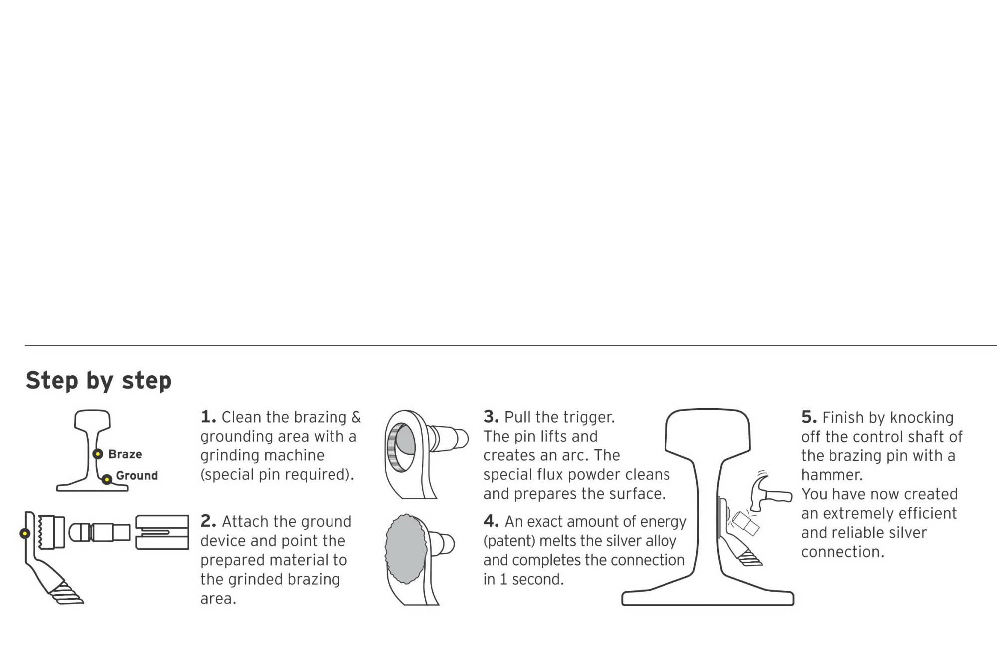 Safetrack® patented electronic PinBrazing system is an extremely efficient, low temperature arc brazing method used for attaching electrical connectors to steel structures such as rails, without the need for drilling holes or welding. It is ideal for connecting cables for signaling, grounding and return/power but can also be used for connecting heat elements and cable clips.