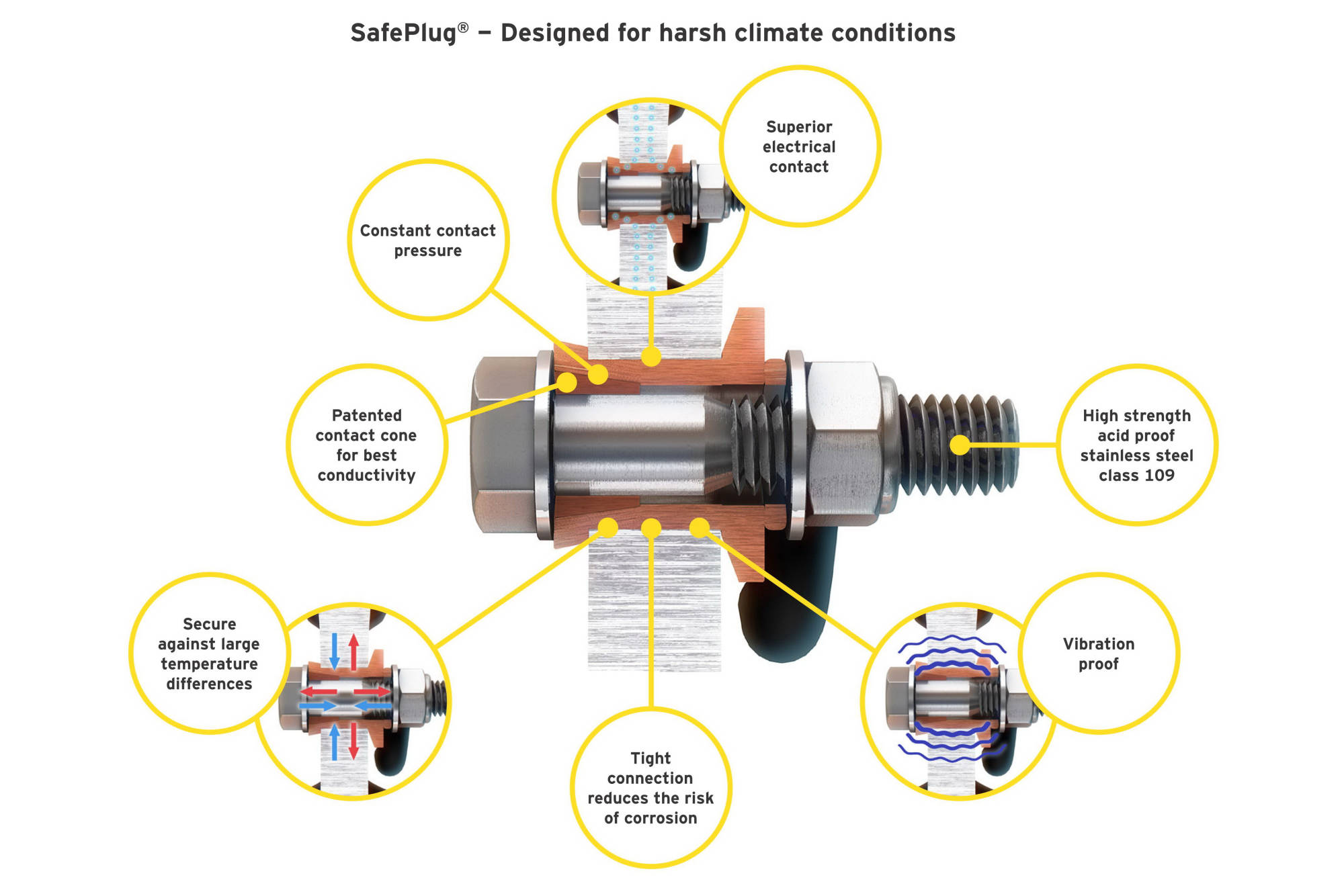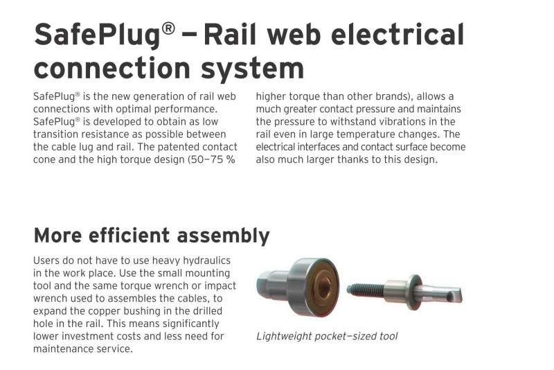 SafePlug® is the new generation of rail web connections with optimal performance. SafePlug® is developed to obtain as low transition resistance as possible between the cable lug and rail.
