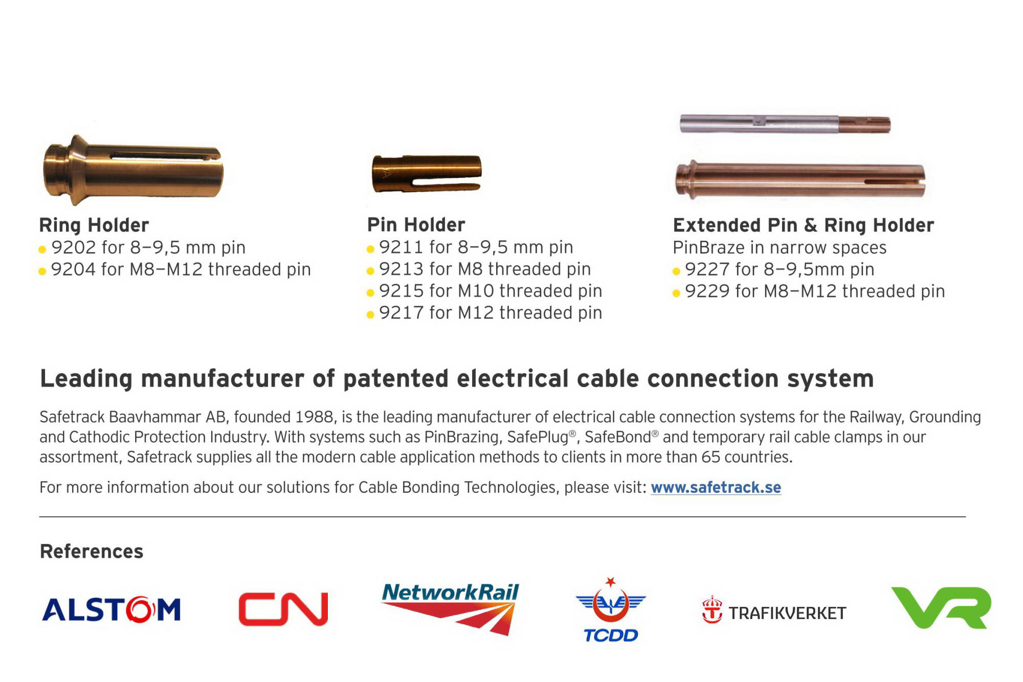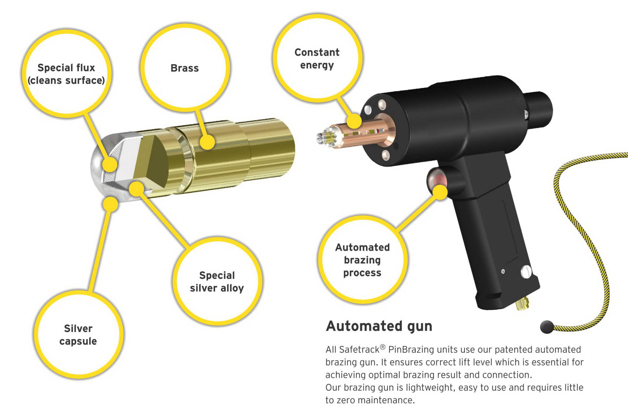 Safetrack® patented electronic PinBrazing system is an extremely efficient, low temperature arc brazing method used for attaching electrical connectors to steel structures such as rails, without the need for drilling holes or welding. It is ideal for connecting cables for signaling, grounding and return/power but can also be used for connecting heat elements and cable clips.