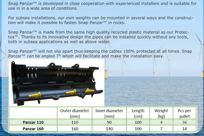 The extremely strong Divisible pipe, protectus consist of two halves that is easily locked safely with side-locks in different colors for different cable types. Protectus are made of recycled polyproylene and can be reused many times. After its life-time it is 100% recyclable. Available in lengths of 1 meter and in 4 diameter (60/110/160/127 mm).